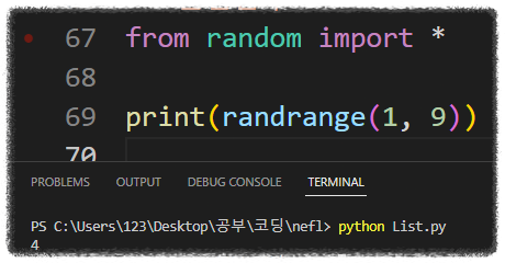 randrange는 괄호 안에 있는 두숫자의 중간 값을 반환 합니다. 예를들어 1과 9가 있다면