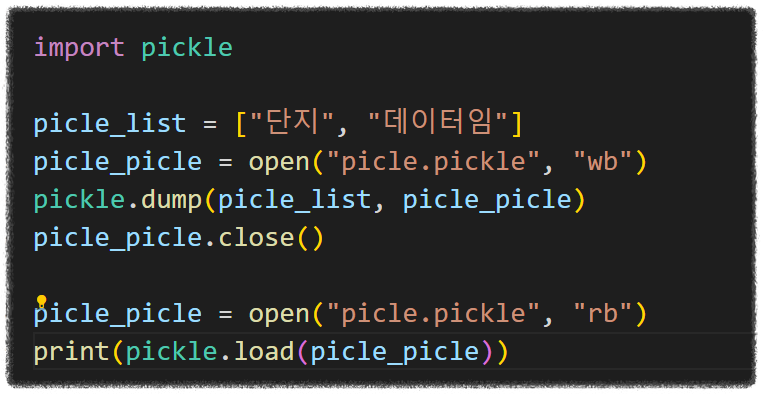 pickle은 파일 입출력을 할때 도와주는 라이브러리 같은것 입니다.