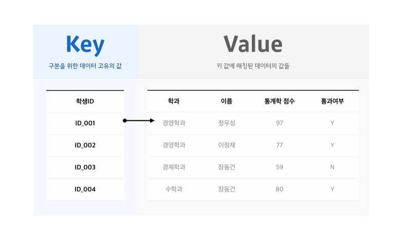 출석부에 이름은 "이름 : 콩순이" 이런식으로 적혀 있을것 입니다. 여기서 이름이 key가 되고