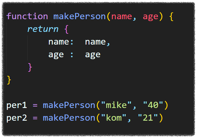 이런식으로 함수를 만들고 전달인자를 받아와서 name과 age를 리턴해줘서 객체를 만들수있습니다.